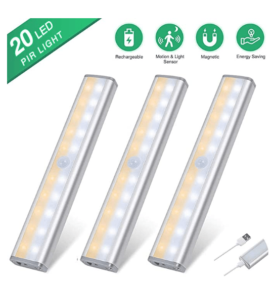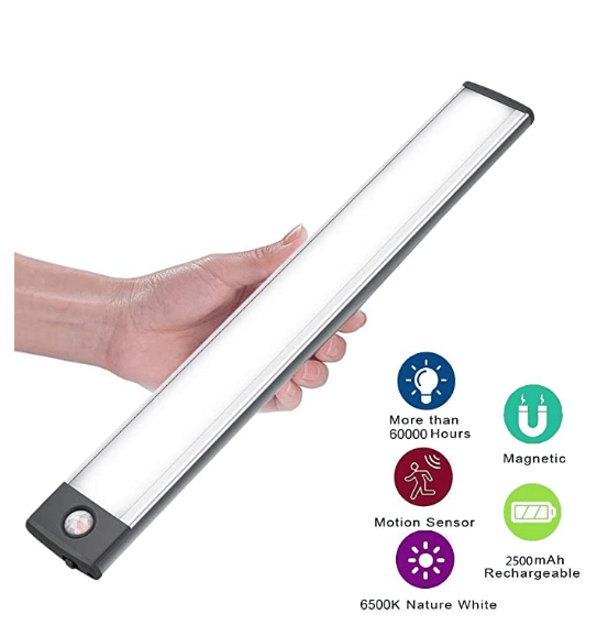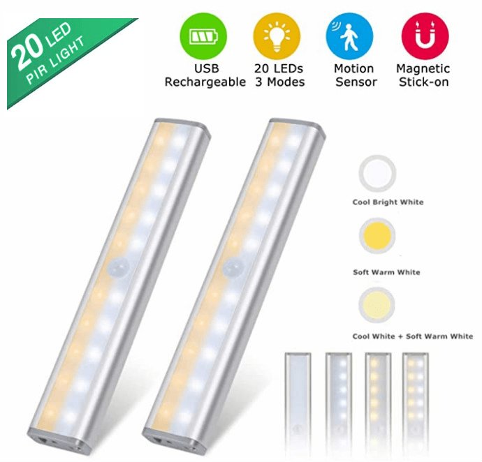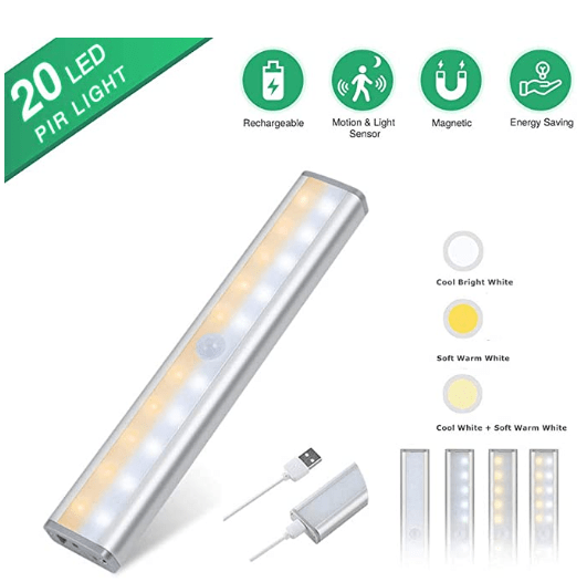 ✓ 20 LED: 18,6 x 3,3 x 2 cm, eingebauter 800-mAh-Akku, hält 30 Tage ( 5 Mal am Tag) nach vollständiger Aufladung im Bewegungssensormodus, 3 Stunden im Always-On-Modus